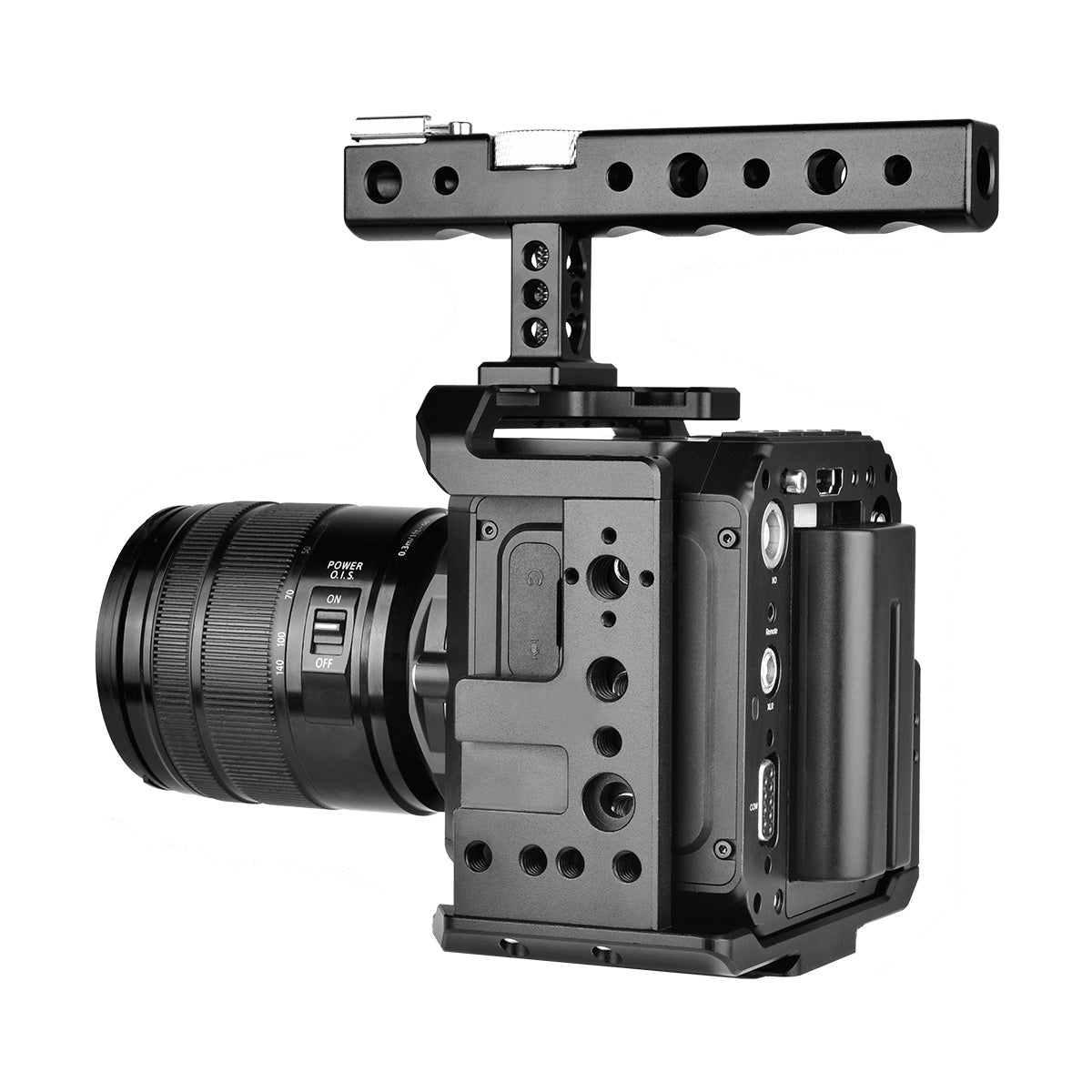 The quick release top handle and various optional side handles can be attached to the cage to provide for different ways to comfortably operate your camera setup.